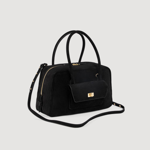 Suede bag with a zip fastening on top, featuring a removable and adjustable shoulder strap for carrying by hand or across the body.