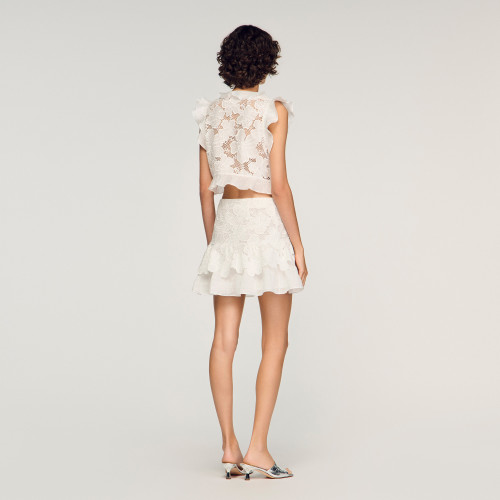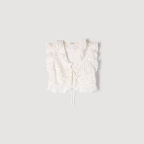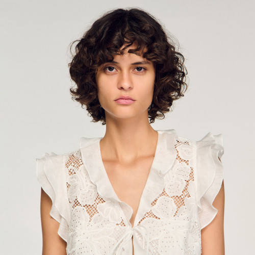 Guipure crop top with a floral pattern, featuring a ruffled V-neckline, short ruffled sleeves and a tie fastening at the front.