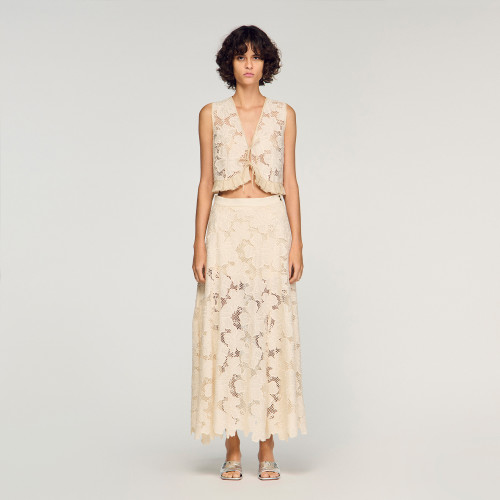 Long flared skirt in floral guipure, with a high waist and a button and zip fastening on the side.