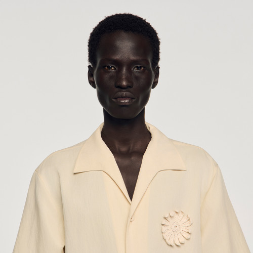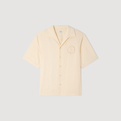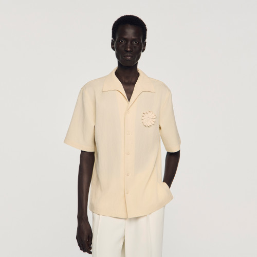 Floaty short-sleeved shirt decorated with a hand-embroidered crochet flower.