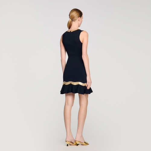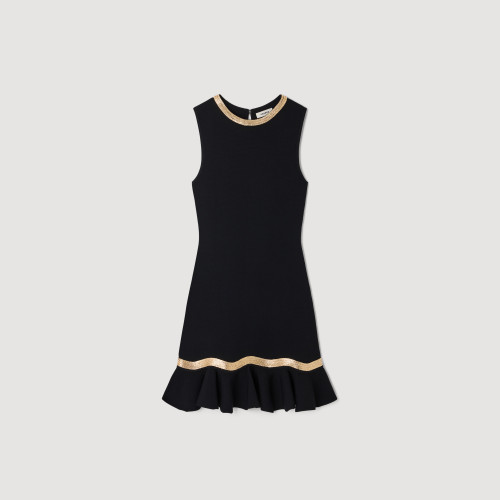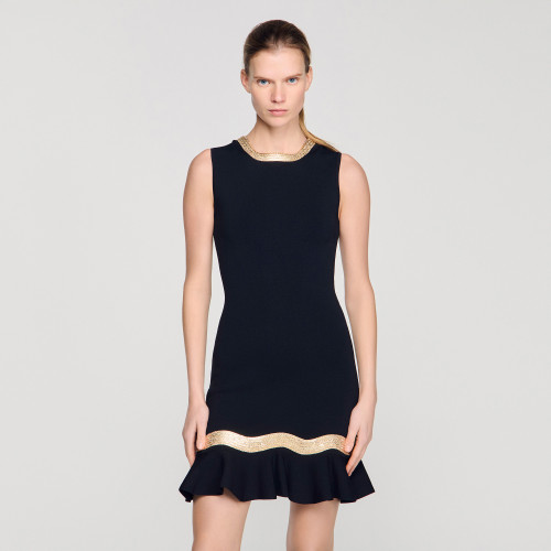 Short knit dress with a fitted bust, metal chain trim and a ruffle on the skirt hem.