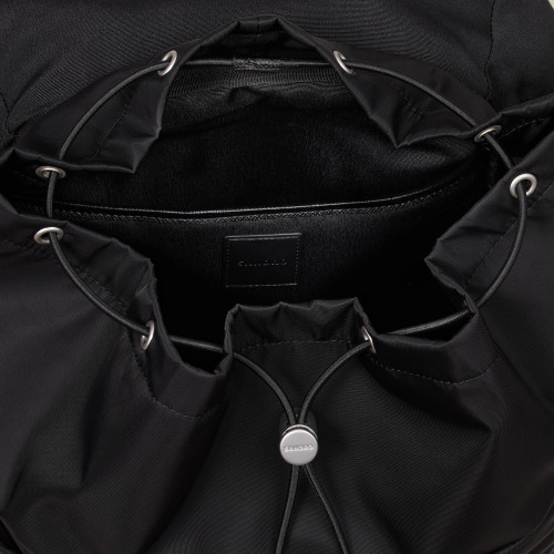 Nylon backpack featuring a flap with adjustable buckles, a zipped front pocket with a recycled leather pull tab, side pockets and a mesh back.
