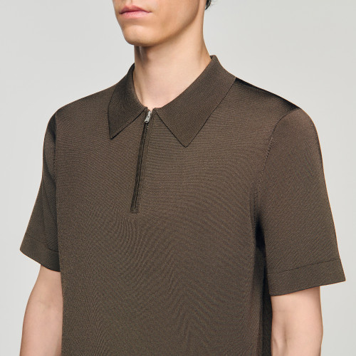Knit polo shirt with zip-up shirt collar and short sleeves.