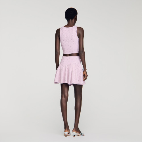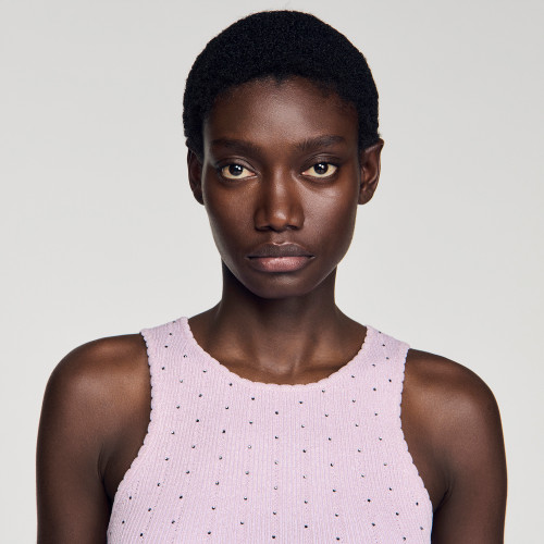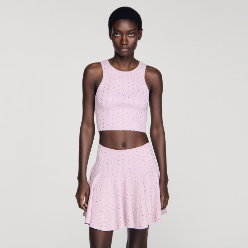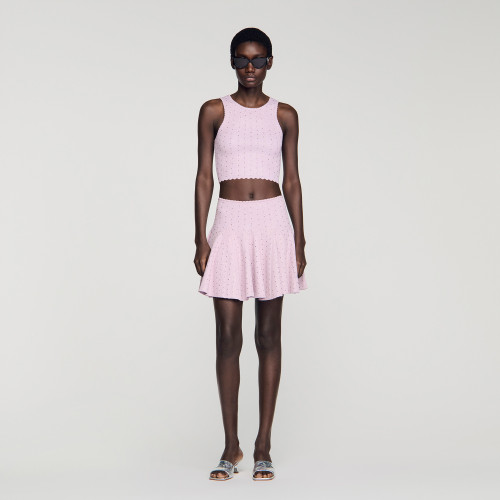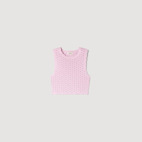 Sleeveless rhinestone-embellished knit crop top with round neck and cocotte stitch finish.