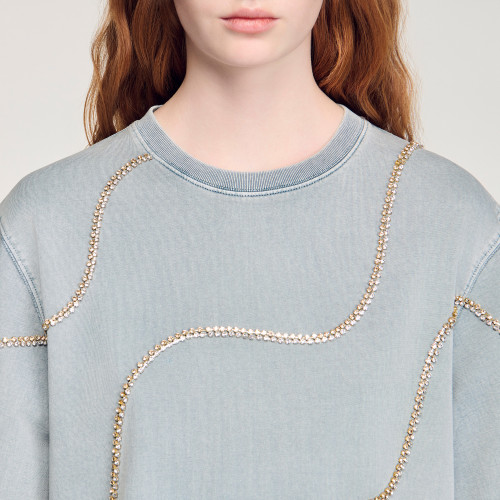 Long, loose-fit T-shirt with a round neck and short sleeves, embellished with rhinestones.