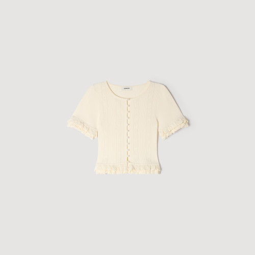 Cropped textured knit cardigan with round neckline, short ruffled sleeves and front pearl button fastening.