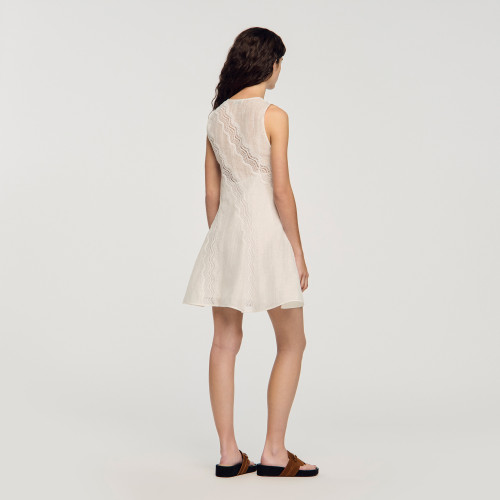 Short sleeveless dress with V-neck, flared cut and decorative trim.