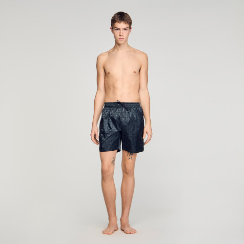 Square cross jacquard swim trunks with an elastic waist with drawstring, side pockets and patch pockets on the back.