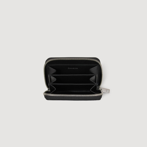 Saffiano effect reconstituted leather coin purse with neck strap.