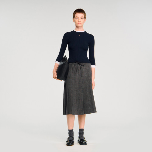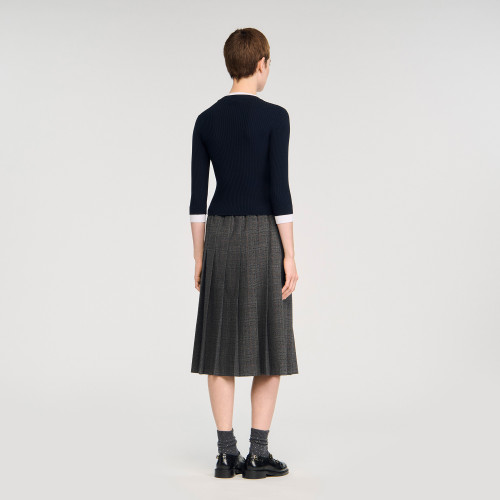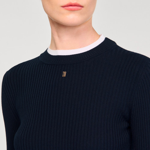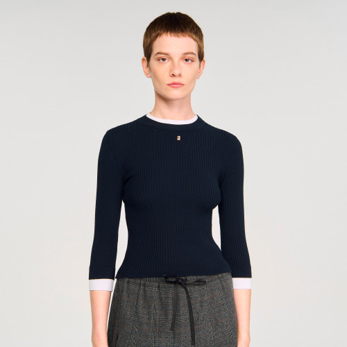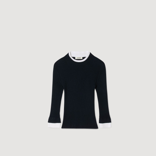 2-in-1 rib knit jumper with round neck and long sleeves featuring trompe contrast trim, and embellished with a signature tag.