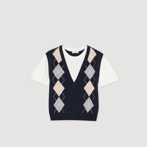 Layered-look jumper with diamond pattern, featuring a round-neck T-shirt overlay and contrasting short sleeves.