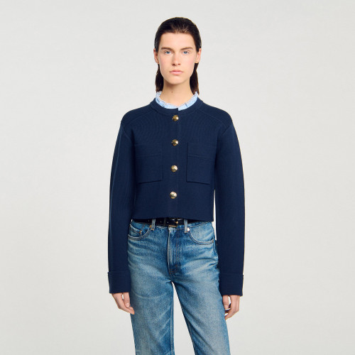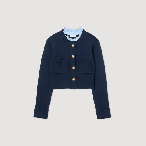 Straight fine knit cardigan with long sleeves, front button fastening and a detachable contrasting ruffled collar.