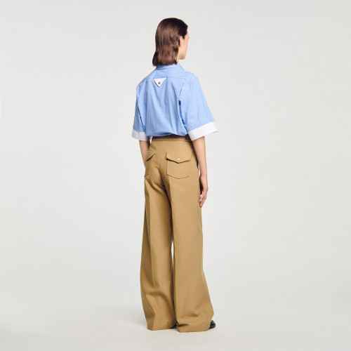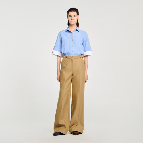 Wide-leg trousers with adjustable buttoned tabs at the waist and Italian pockets.