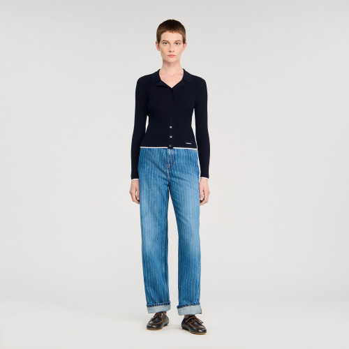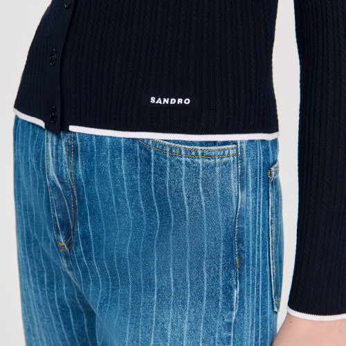 Cropped polo collar cardigan with button fastening, long sleeves, and embellished with a contrasting band and SANDRO embroidery on the hem.