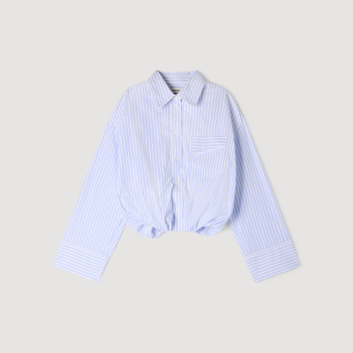 Ruched and elasticated striped cropped shirt with a shirt collar, long sleeves and button fastening.