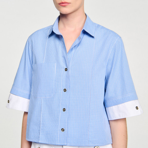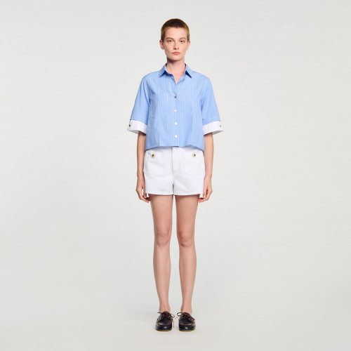 Flared denim shorts with a high waist and buttoned patch pockets at the front.