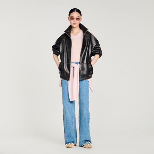 Oversized jacket in distressed vintage-look leather, featuring a standing collar and zip fastening.