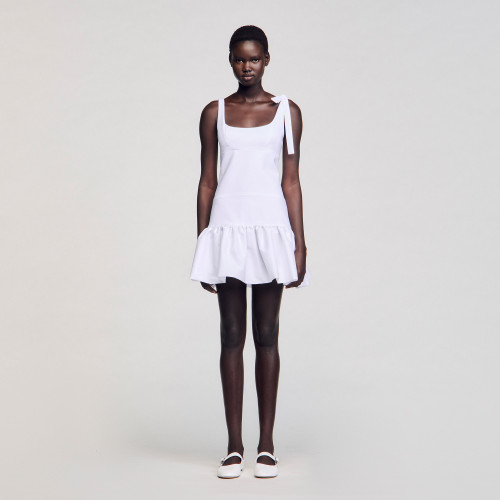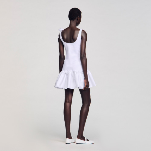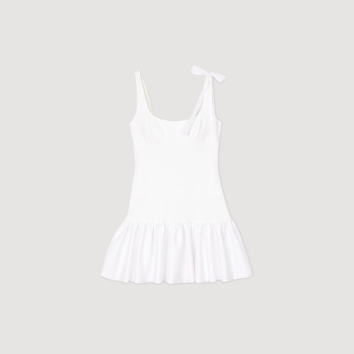 Short dress in mixed materials with heavy jersey on the top and technical taffeta on the bottom, featuring straps (one with a bow), a round neckline at the front and back and a full ruffled skirt.