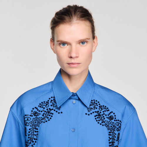 Oversized, hand-embroidered and beaded shirt with shirt collar, short sleeves and front button fastening.