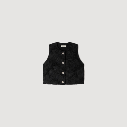 Sleeveless crop top in floral embroidered guipure lace with round neckline, adorned with jewel buttons on the front.