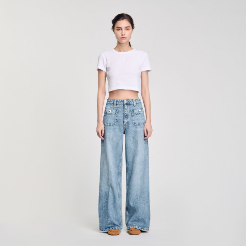 Faded straight-leg jeans featuring patch pockets with decorative buttons.