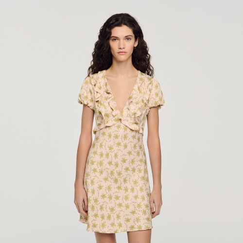 Short floral-print dress with a floaty fit, featuring a ruffled top and slightly flared skirt.