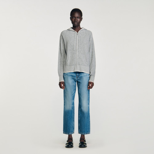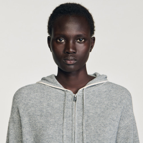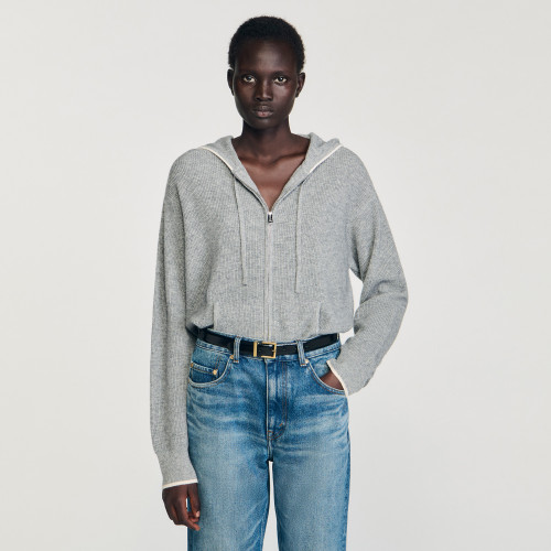 Ribbed knit cardigan with drawstring hood and front pockets with contrasting edges.
