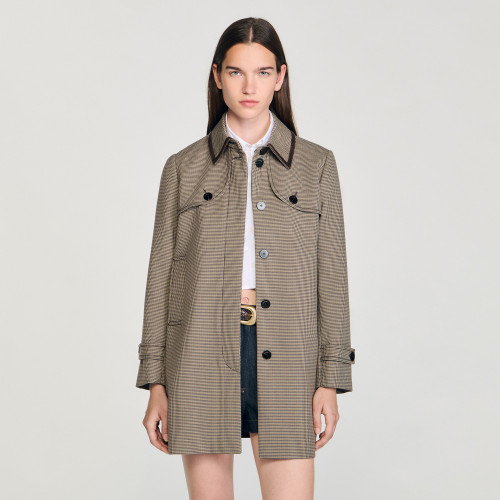 Mid-length fluid trench coat with houndstooth pattern, pleated back and leather-trimmed collar.