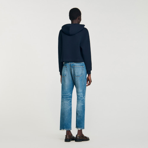 Fine knit hoodie with zip fastening, long sleeves and denim patch pockets.