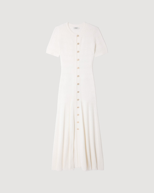 Knit maxi dress with short sleeves, round neckline and flared skirt.