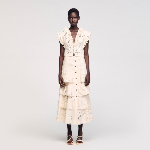 Long, flounced skirt in floral guipure, with buttoned placket and front slit.
