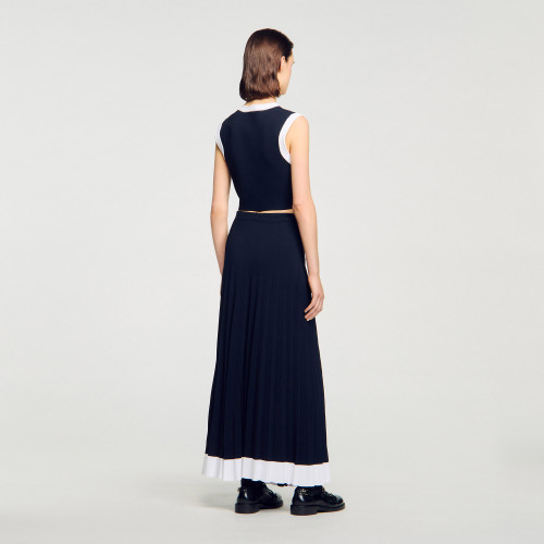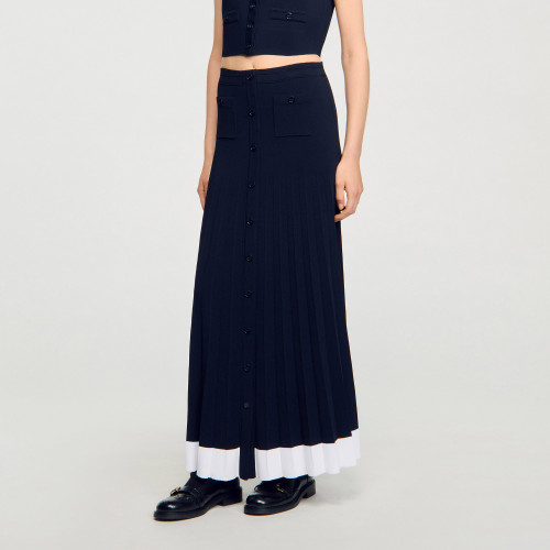 Long flared knit skirt with button fastening, pockets and contrasting hem.