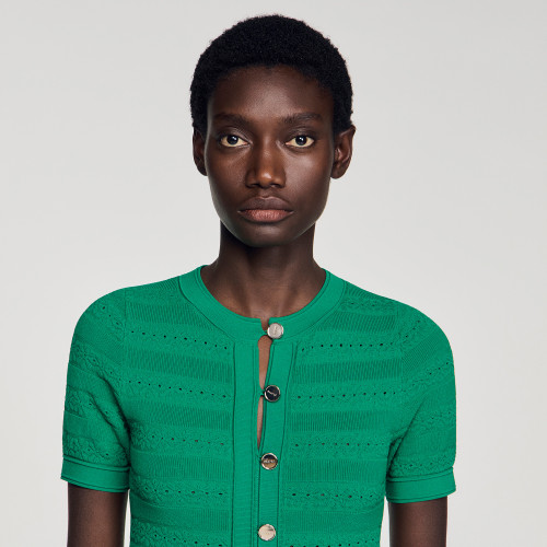 Knit maxi dress with short sleeves, round neckline and flared skirt.