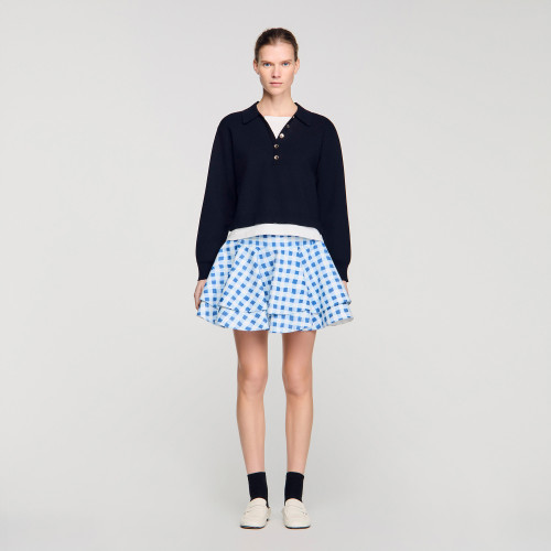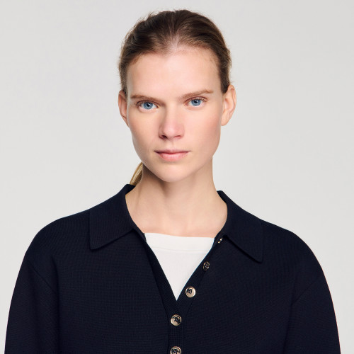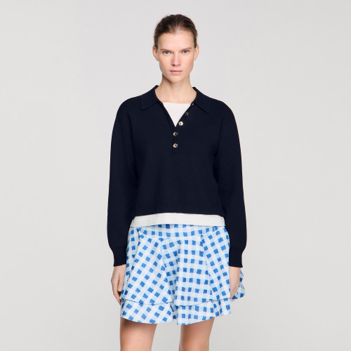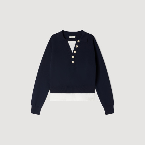 Straight-cut, layered-effect jumper in a plain knit, featuring a round neck with a polo collar, long sleeves and decorative buttons.