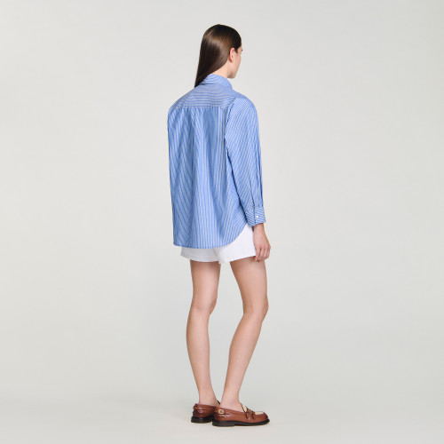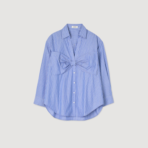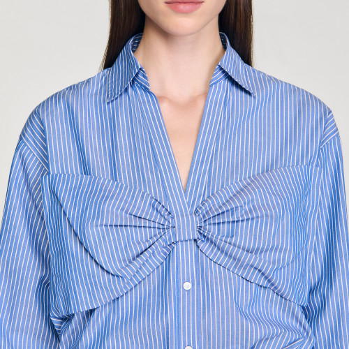 Oversized striped shirt with a V-neckline and shirt collar, long sleeves with buttoned cuffs and a large pleated bow on the front.