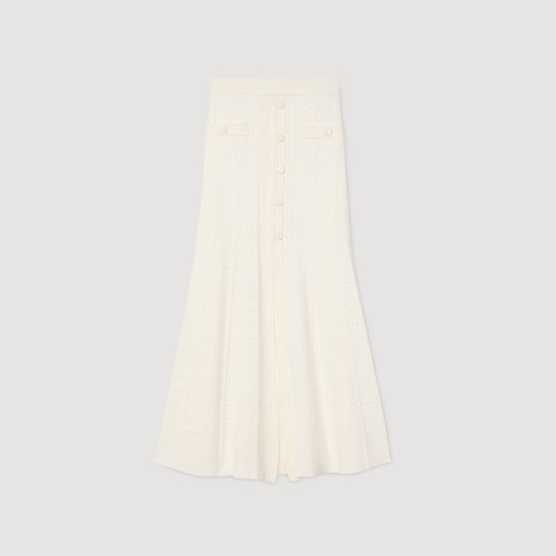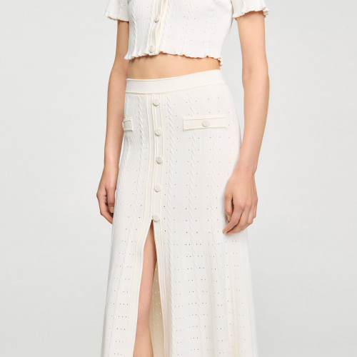 Midi skirt with a slit in decorative pointelle knit, featuring a decorative button placket and side pockets.