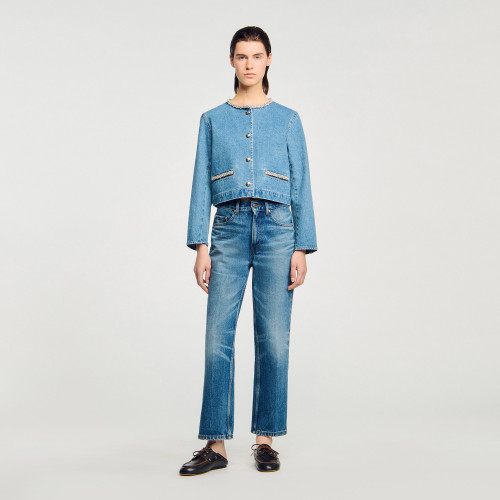 Faded denim jacket with a jacket style, embellished with rhinestone trim, featuring a round collar, long sleeves with slit and button, and welt pockets adorned with rhinestones.