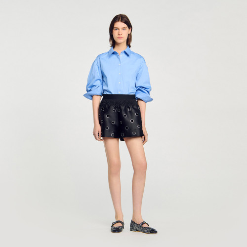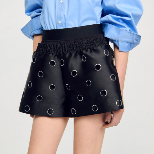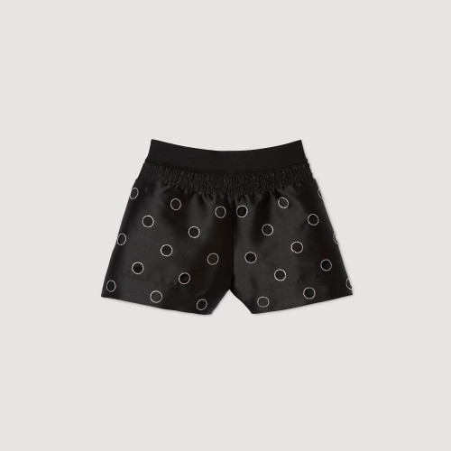 Wide-leg satin shorts adorned with openwork rhinestone circles, featuring a high waist and an elasticated smocked waistband.