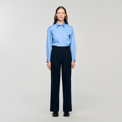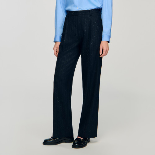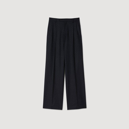 Straight-leg, wide trousers with rhinestone stripes, featuring belt loops and slanting pockets.