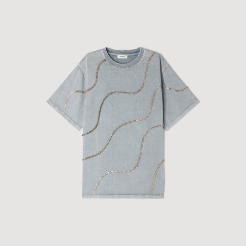 Long, loose-fit T-shirt with a round neck and short sleeves, embellished with rhinestones.
