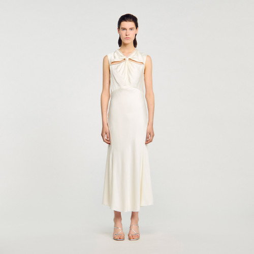 Long, floaty satin-effect dress with a crossover neckline and openwork adorned with a rhinestone trim.