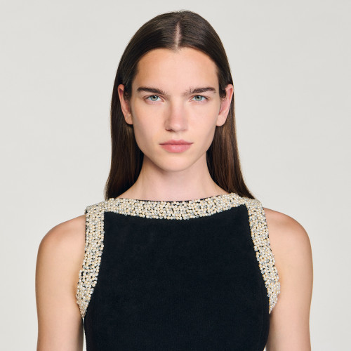 Sleeveless short velvet knit dress with a boat neck, pearl-embellished armholes, and a small ruffle at the bottom.