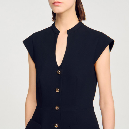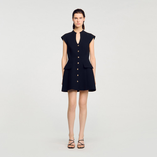 Sleeveless structured short dress with a V-neckline, button fastening and a voluminous skirt