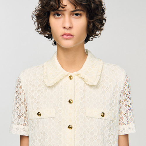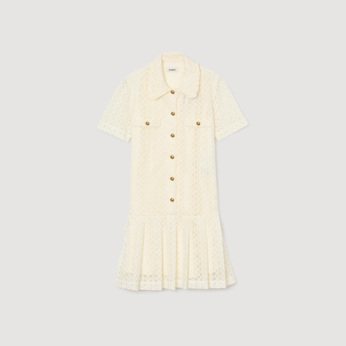 Short lace dress with a shirt collar, button fastening and short sleeves.
