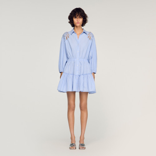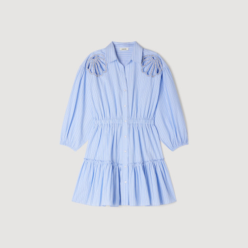 Short striped dress embroidered with rhinestone shells, featuring a shirt collar, long sleeves with elasticated cuffs and an elastic waist creating a wide top and flared skirt.