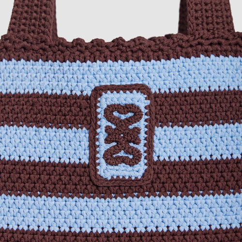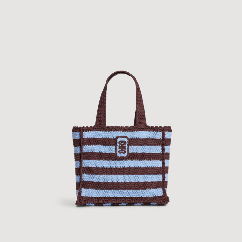 Two-tone striped crochet knit bag with a SANDRO logo patch.