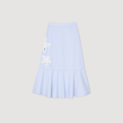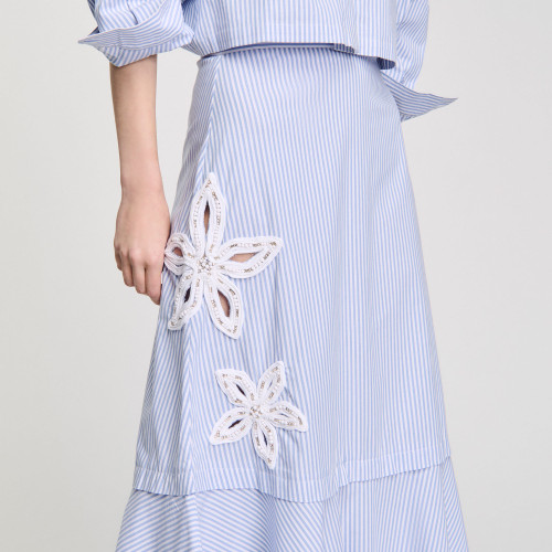 Long striped skirt with beaded and rhinestone embroidered flowers.