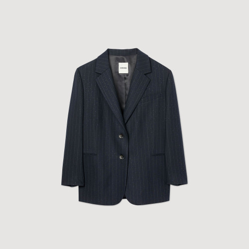 Oversized striped suit jacket with all-over rhinestones, featuring a lapel collar and long sleeves.