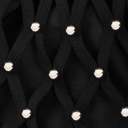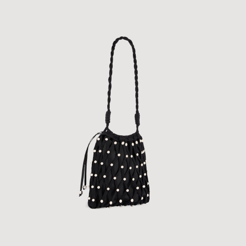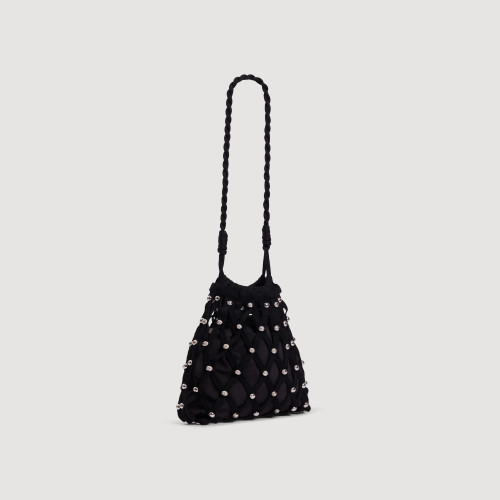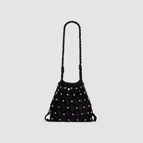 Net-style mesh shoulder bag adorned with studs, featuring an inner pouch with a drawstring.