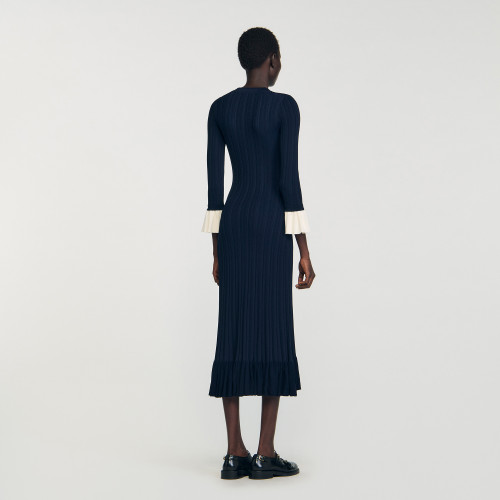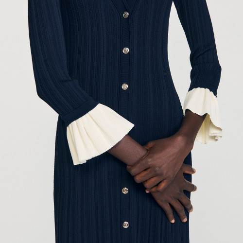 Knit maxi dress with V-neckline, contrasting ruffles on the end of the sleeves, ruffled bottom hem on skirt and button placket.